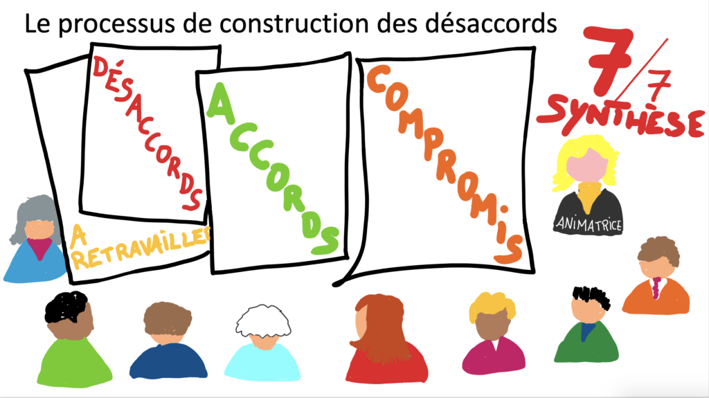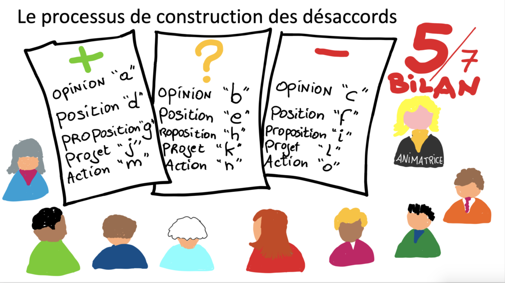 La démarche de construction des désaccords porte la conviction que la démocratie ne repose pas d’abord sur des consensus mais sur une capacité à identifier les désaccords, à les mettre en débat, à les travailler et à en dégager des compromis durables qui n’ignorent pas les divergences mais qui les intègrent comme une ressource pour la dynamique collective.