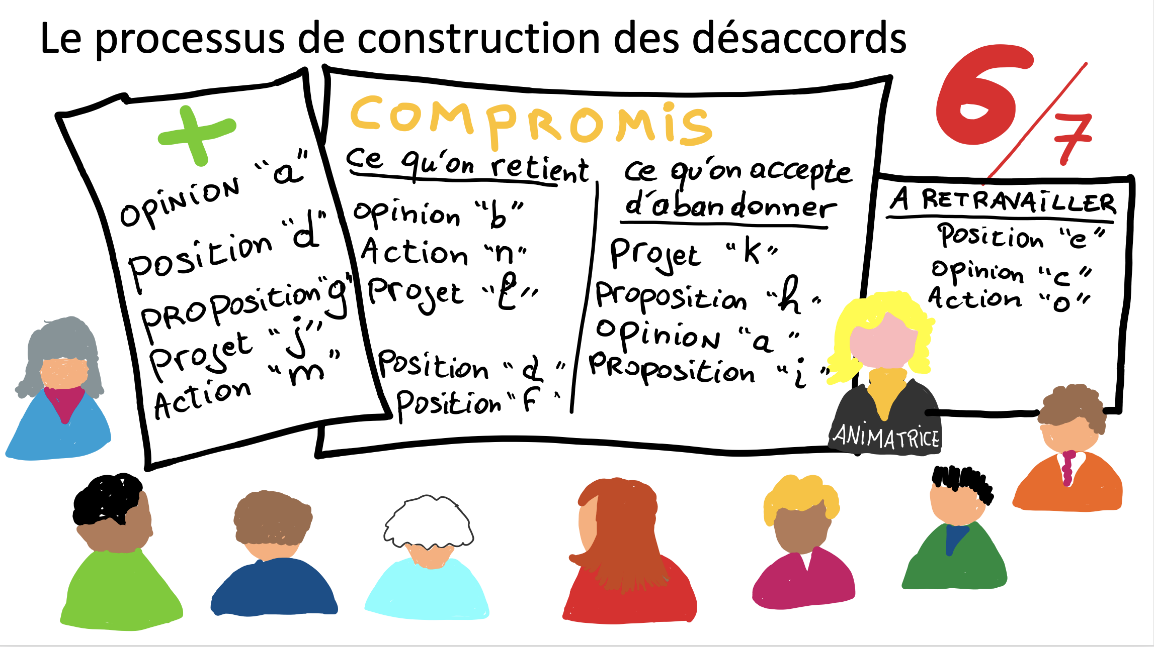 Le compromis qui résultera des débats intégrera les désaccords. En effet, la démarche suivie ne permet plus de mettre sous le boisseau les points de désaccord. Ceux-ci restent présents, ils sont identifiés, notés et repérés. Ils constituent le socle des accords parce que ces derniers, dans une visée démocratique, ne disparaissent jamais du paysage. Ils constituent le socle des accords parce que c’est bien sur le terreau fertile des désaccords qu’a pu se déployer un accord sous forme de compromis.