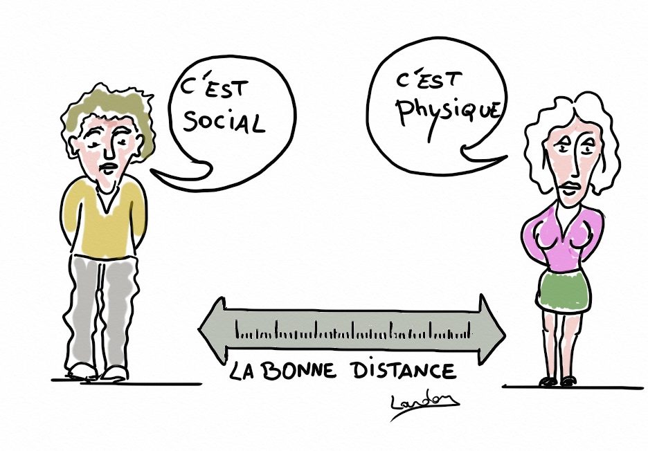 Se tenir à distance, physique, d’une personne contagieuse relève du bon sens et les consignes de l’OMS ou du gouvernement doivent être scrupuleusement respectées pour limiter le risque pandémique. Il s’agit alors de se tenir à l’écart, physique, d’autrui. La distance matérielle relève ici d’un choix, d’une culture ou, dans le cas présent, d’une consigne : chacun gradue son rapport physique à l’autre qui va de l’intime au public. En situation de confinement, on reste en proximité physique de ceux avec qui on vit chez soi (l’intime) et on met les distances avec ceux de l’extérieur (le public). Cela ne fait qu’exacerber la géographie physique des corps qui structure l’espace matériel de notre société de la sphère du privé jusqu’à l’espace public.